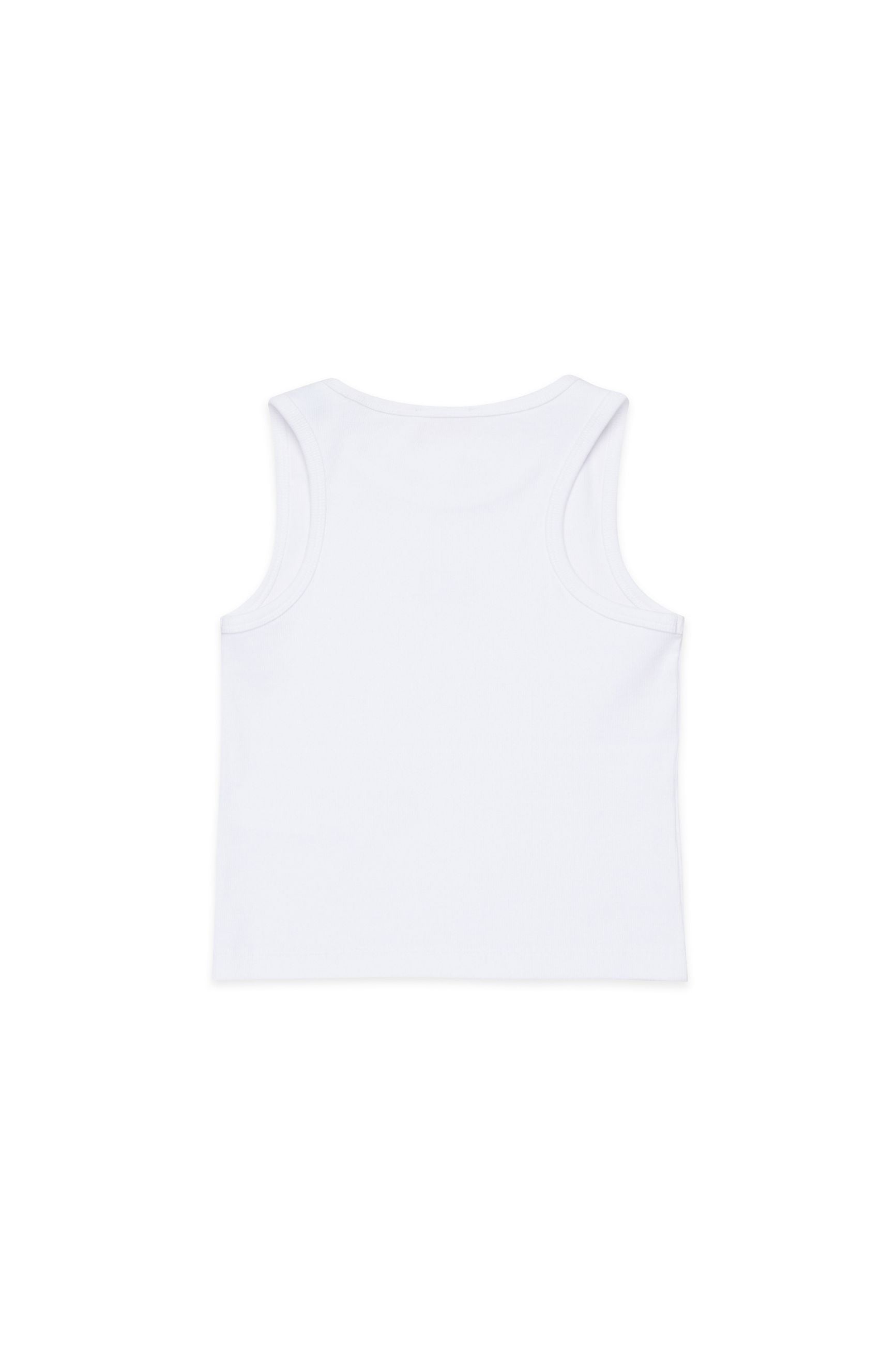 Questa canotta da ragazza presenta un classico scollo rotondo e un design senza maniche, realizzata in cotone elasticizzato finemente a costine per una vestibilità aderente e flessibile. Minimal ma cool, il davanti è impreziosito da una patch con logo D rosso al centro del petto.