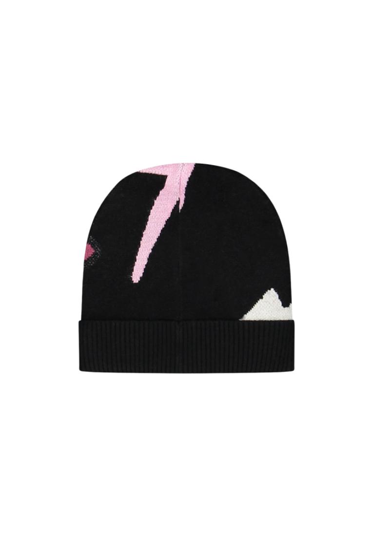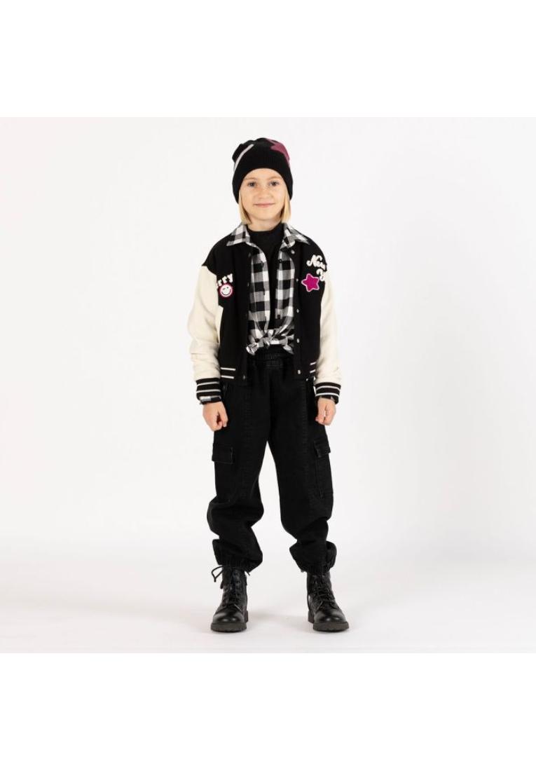 Berretto per bambina realizzato in tricot dalla mano morbida e calda di colore nero, lavorato in jacquard con stelle e lampi in contrasto di colore. Rifinito con risvolto in costina.