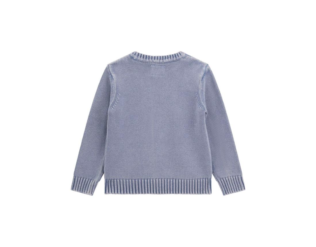Maglioncino tricot in puro cotone a maniche lunghe e scollo rotondo. Effetto delavé con maxi patch lettering applicato sul davanti. Collo, fondo e polsi elasticizzati rifiniti a coste.