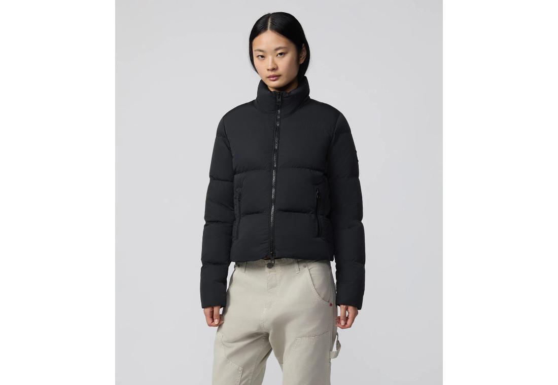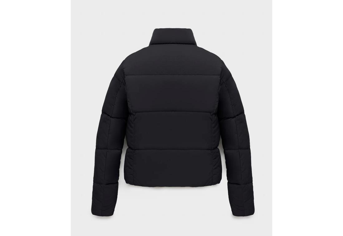 Piumino corto da donna con trapunta orizzontale ampia, vestibilità slim e taglio cropped per un look deciso e contemporaneo. Realizzato in nylon ultra-light con finitura super gloss dall'effetto WET, morbido e performante. Imbottito con piuma 90-10 certificata RDS per garantire calore e leggerezza. Collo in piedi, zip frontale e tasche con chiusura a zip completano il design. Un capo essenziale per affrontare l’inverno con stile e funzionalità.