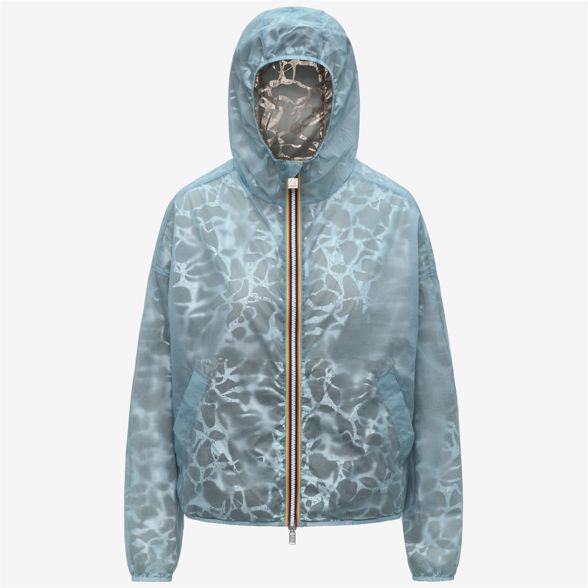 Laurette è una giacca corta da donna ideale per le stagioni più miti. Il design reversibile gioca con i contrasti tra texture e trasparenze: un lato è in tessuto superleggero semitrasparente, l’altro in nylon con una grafica a laminatura metallica ispirata ai riflessi del sole sull’acqua increspata. Quando indossata dal lato superlight, la grafica sottostante emerge in trasparenza creando un effetto cangiante.